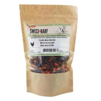 SWISS BARF Trocken Menu ist in den Fleischsorten Schweizer Poulet und Schweizer Rind erhältlich und enthält je nur eine einzige tierische Proteinquelle (Monoprotein). Optimal für unterwegs wenn es schnell, einfach und bequem gehen soll.