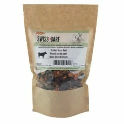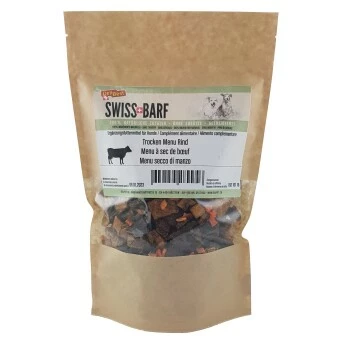 SWISS BARF Trocken Menu ist in den Fleischsorten Schweizer Poulet und Schweizer Rind erhältlich und enthält je nur eine einzige tierische Proteinquelle (Monoprotein). Optimal für unterwegs wenn es schnell, einfach und bequem gehen soll.
