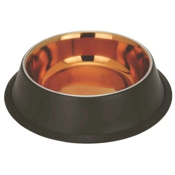 Ganz neues Design für einen Chromstahlnapf. Der auswechselbare Gummiring verhindert das Rutschen.