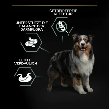 Entwickelt von unseren Tierärzten und Ernährungswissenschaftlern, verbessert PURINA PRO PLAN die Gesundheit des Verdauungssystems – Unser vollwertiges, getreidefreies Hundefutter ist speziell auf die Bedürfnisse von ausgewachsenen Hunden mittleren und großen Rassen abgestimmt. Es enthält eine ausgewählte präbiotische Quelle, die nachweislich ein gesundes Verdauungssystem und eine normale Kotkonsistenz fördert.