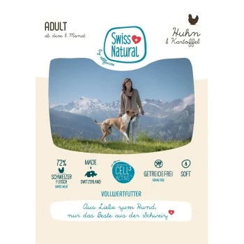 Swiss Natural Soft ADULT ist eine hochwertige getreidefreie Vollnahrung mit 72% Hühnerfleisch aus der Schweiz. Durch unser schonendes Herstellungsverfahren SOFT bleibt in den Futterbrocken bis zu 30% Restfeuchte enthalten. Mit dem Monoprotein und ImmunoCell3aktive steht dieses Futter für eine optimale Verträglichkeit.