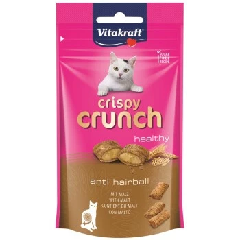 Mit diesen unwiderstehlich leckeren Knusperkissen lässt sich Ihre Katze liebend gern verwöhnen! Jeder Biss bietet dem Stubentiger dank der cremigen Füllung eine neue kleine Überraschung. Zudem überzeugt Crispy Crunch mit Malz durch einen konkreten Zusatznutzen, denn der Knuspersnack fördert das natürliche Ausscheiden der bei der Fellpflege verschluckten Haare. Crispy Crunch – aktiv gegen Haarballen!